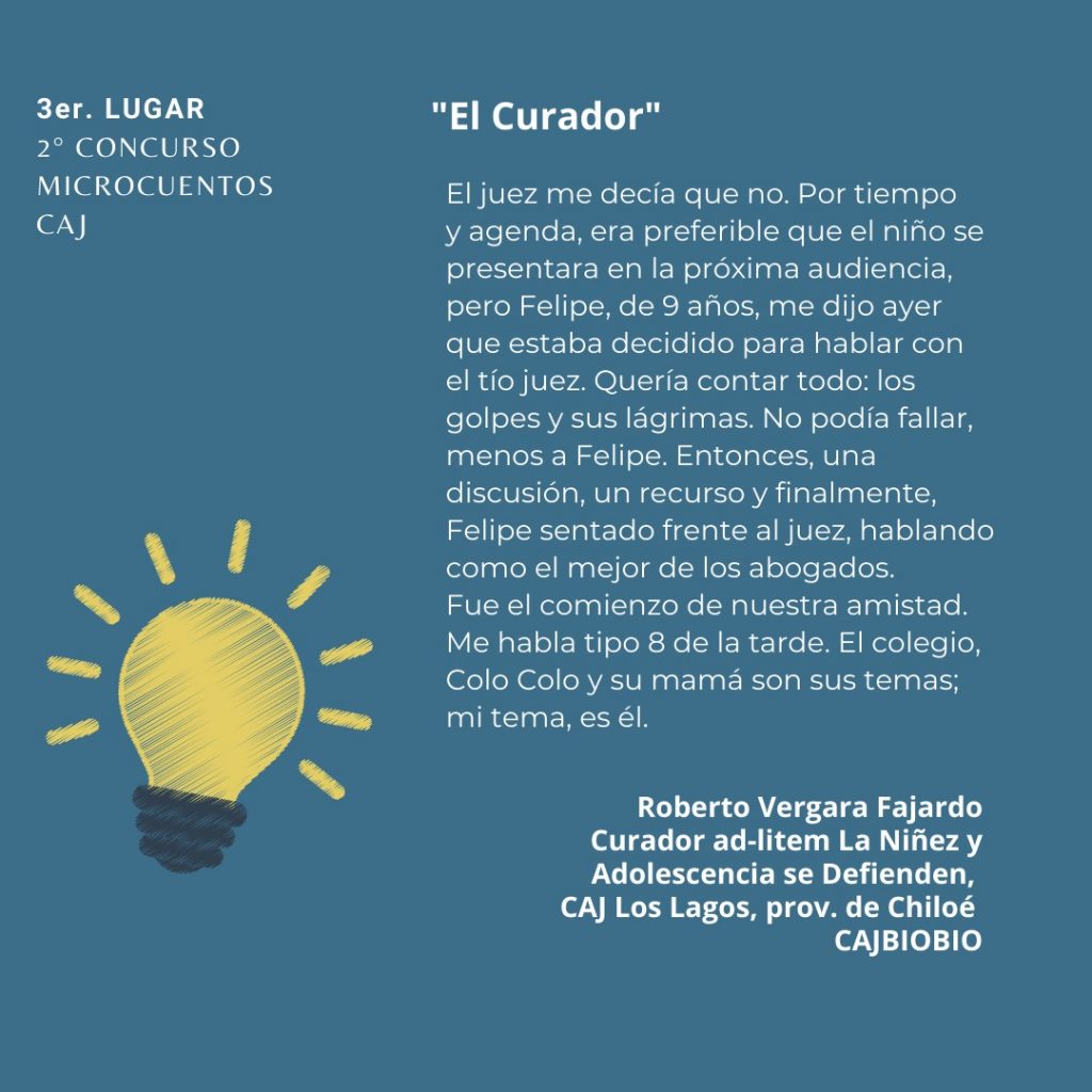 Tercer lugar: “El Curador” de Roberto Vergara Fajardo, Curador ad Litem de la línea de representación especializada “La Niñez y Adolescencia se Defienden”, CAJ de Los Lagos, provincia de Chiloé de CAJBIOBIO.