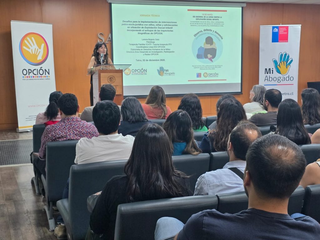 El Programa Mi Abogado (PMA) de la Región del Maule y la Corporación Opción, llevó a cabo una jornada dedicada al análisis y fortalecimiento de la intervención psicojurídica con niños, niñas y adolescentes en situación de explotación sexual, la cual contó con la presencia de autoridades judiciales, fiscales y representantes de los tribunales, quienes compartieron experiencias y reflexiones en torno a este desafío, uno de los pilares de trabajo del PMA Maule para el año 2025.